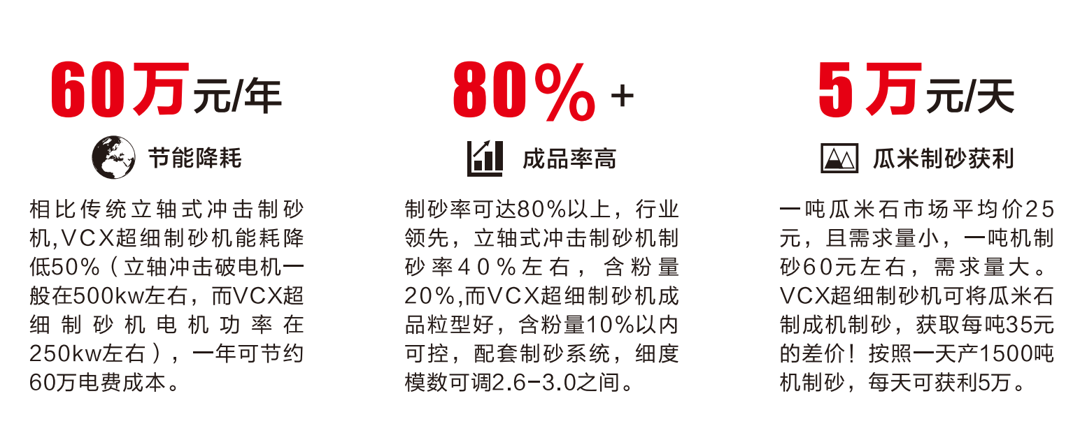 VCX超細(xì)制砂機制砂率可以達到80%以上,這一制砂率在目前瓜米石制砂處理上,是當(dāng)之無愧的行業(yè)領(lǐng)軍者。此外,該制砂機選配了250kw左右功率的電機,相較傳統(tǒng)立軸式?jīng)_擊破,能耗降低了50%,細(xì)算下來,一年可節(jié)約60萬電費成本。