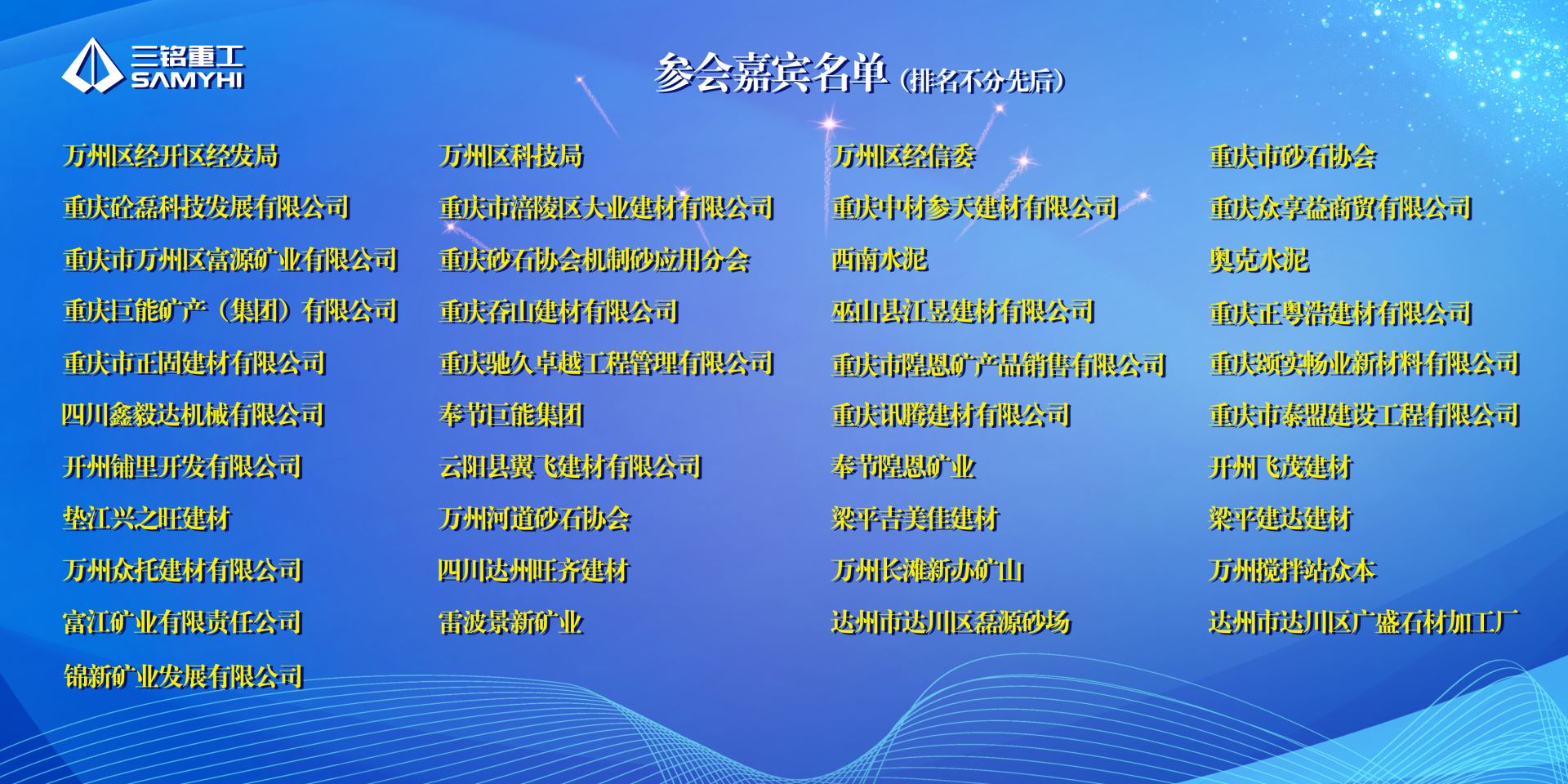 萬州區(qū)經(jīng)發(fā)局局長萬小莉、萬州區(qū)科技局副局長晏東、萬州區(qū)經(jīng)信委科技科科長蔣正宏、萬州區(qū)經(jīng)信委中小創(chuàng)業(yè)科科長睢文、重慶砂石協(xié)會副會長兼秘書長黎長華、重慶砼磊科技發(fā)展有限公司董事長張先余、重慶市順志礦業(yè)有限公司董事長張曉陽、重慶市砂石協(xié)會監(jiān)事長兼專家組長趙勇、重慶大學(xué)材料科學(xué)與工程學(xué)院建材副主任、建設(shè)工程質(zhì)量檢測中心實驗室主任葉建雄、重慶市涪陵區(qū)大業(yè)建材有限公司技術(shù)總監(jiān)巢德明、重慶眾享益商貿(mào)有限公司總經(jīng)理趙鵬飛、巫山縣江昱建材有限公司營銷總經(jīng)理柯勵峰、重慶市三銘重工有限公司董事長龍福建、重慶市三銘重工有限公司總經(jīng)理龍涵李玨出席活動。