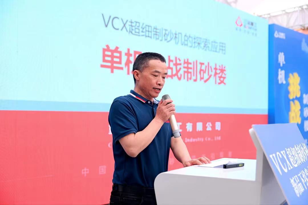 研發(fā)工程師譚賢成緩緩走向主席臺,向大家詳細介紹了VCX超細制砂機的性能,制砂率超80%,節(jié)能降耗50%,粉含量降低10%,成品砂粒型優(yōu)異、級配合理,當之無愧為精品機制砂的新選擇!