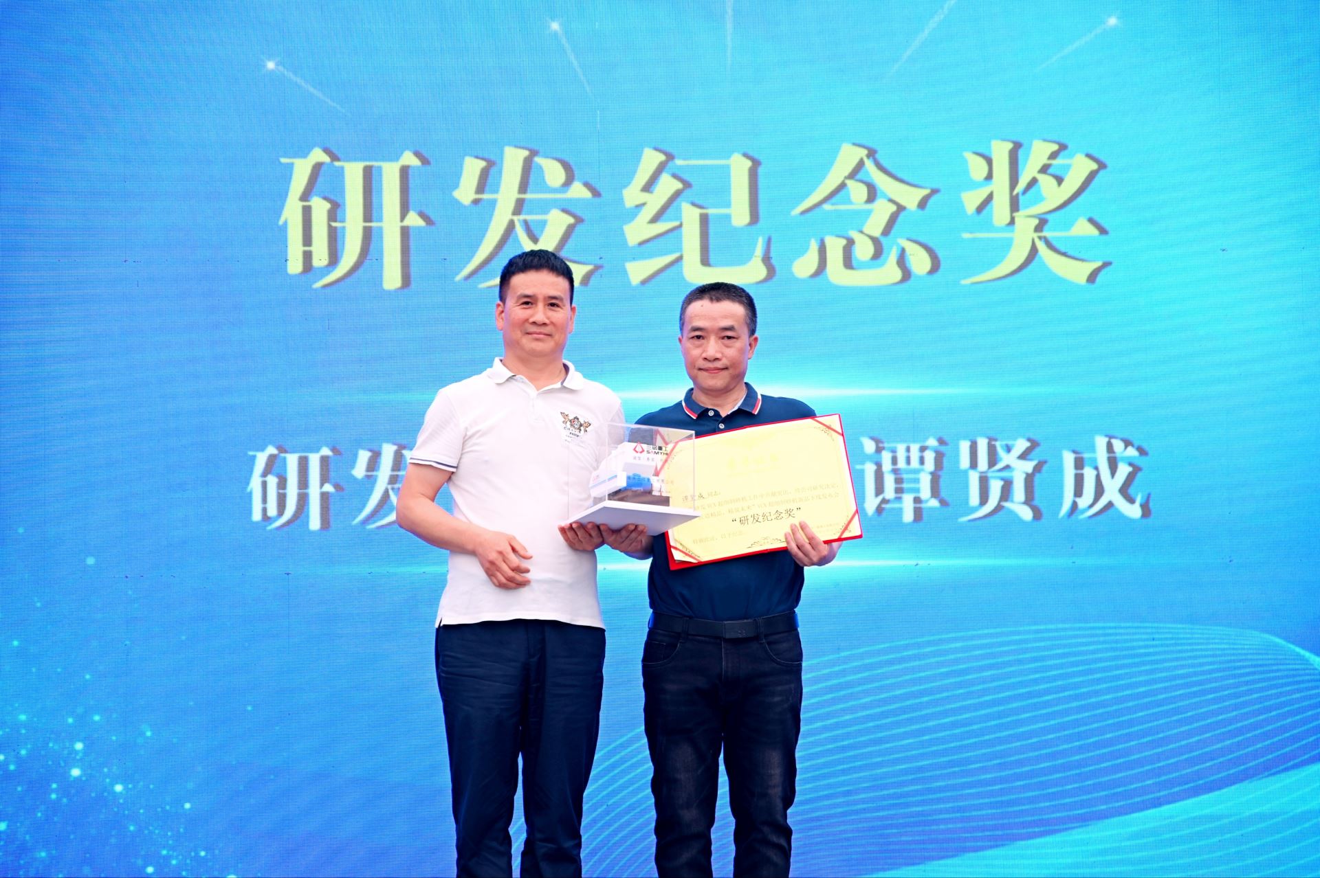 發(fā)布會現(xiàn)場三銘重工董事長龍福建,還為研發(fā)工程師譚賢成頒發(fā)了研發(fā)紀念獎,感謝他的辛苦付出。