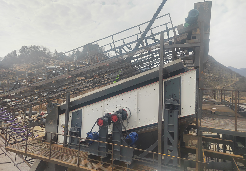 The DYS double-shaft vibrating screen is used for graded screening, and the water washing process, stone powder silo, and finished aggregate storage silo are designed.